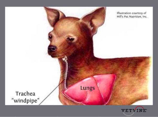 The trachea ("windpipe") is an anatomic structure that connects the larynx to the lungs. The trachea carries inhaled air into the lungs, and as the animal exhales, the trachea carries it away.