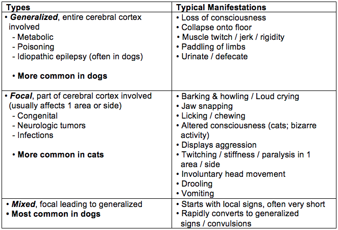 Also called ictus or convulsions, seizures are a temporary dysfunction of normal electrical activity in the brain. Seizures (particularly epilepsy, loosely defined as recurrent seizures) are the most common neurologic disorder in both cats and dogs. They start and stop abruptly and most are self-limiting, lasting about 2-3 minutes or less. Seizures that last 5 minutes or longer, or that happen 2 or more times without recovery in between are called status epilepticus (SE). SE is considered an immediate medical emergency, as are cluster seizures (CS; 2 or more seizures within 24 hours).