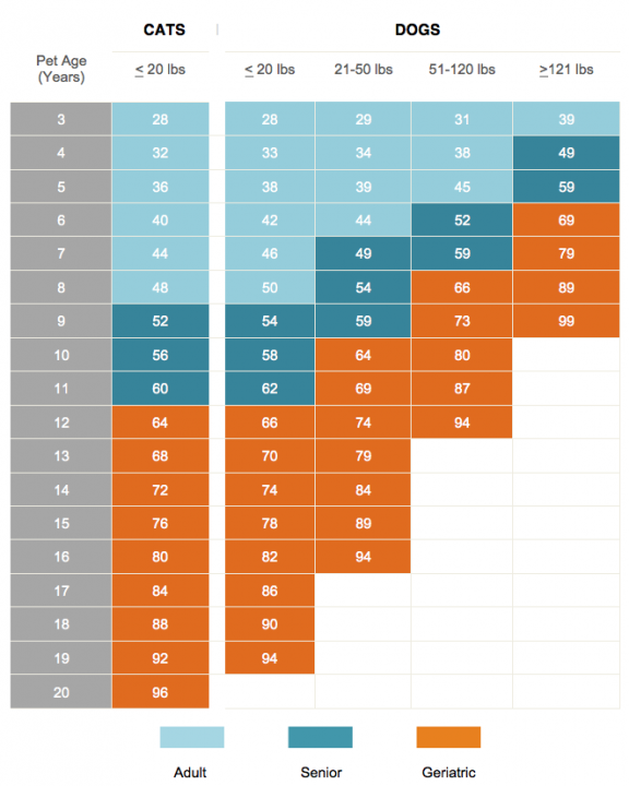 Classification of life stage and differentiating an adult from a senior or a geriatric pet has been somewhat arbitrary, and over the years various pet/human age analogy charts have been developed. It’s widely known that lifespan of dogs can be associated with breed type. For example toy breeds typically live longer than giant breed dogs. As such, it’s been suggested that the classification of life stage should be associated with the weight of the dog and not its age.