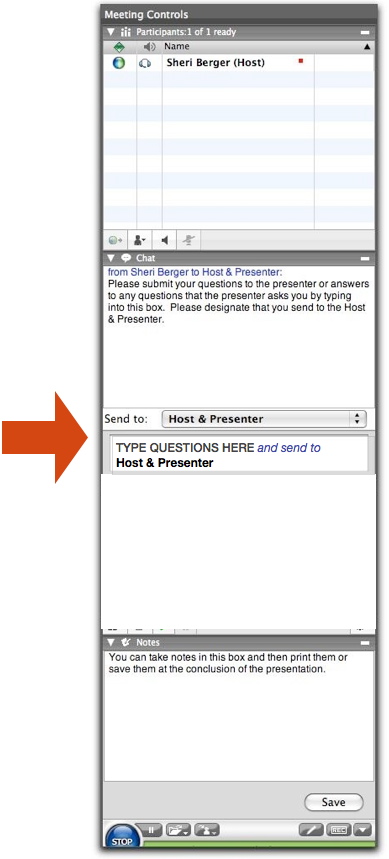 - NOTES BOX: IF your meeting permits, you can take notes by typing into the expanded box – at the end of the presentation, you will be able to print them or save your notes to a file on your computer. Either click on “SAVE” in the notes box OR click on “File” in the Meeting Center bar at the top of your screen and click on “Save As"