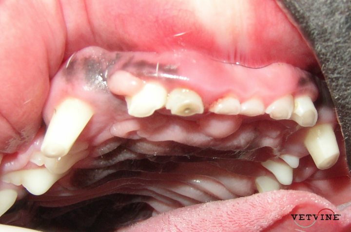 The anterior teeth of this dog demonstrate "abrasion" - significant mechanical wear due to chewing