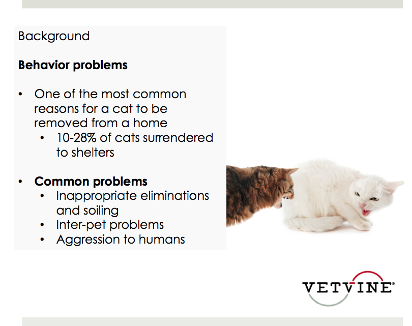 Behavior problems in cats can lead to their relinquishment from the home they live in. In fact, up to 28% of cats that wind up in shelters were given up due to a problem behavior. The more common problems reported include house soiling, inter-pet problems, and aggression to humans.