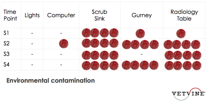 The focus of a recent Specialty Update is the incidence and sources of intraoperative bacterial contamination and the correlation with postoperative surgical site infections in dogs undergoing a clean orthopedic surgery. This pictogram reveals an interesting finding reported in that discussion - specifically, the bacterial load of various areas of the veterinary hospital setting.