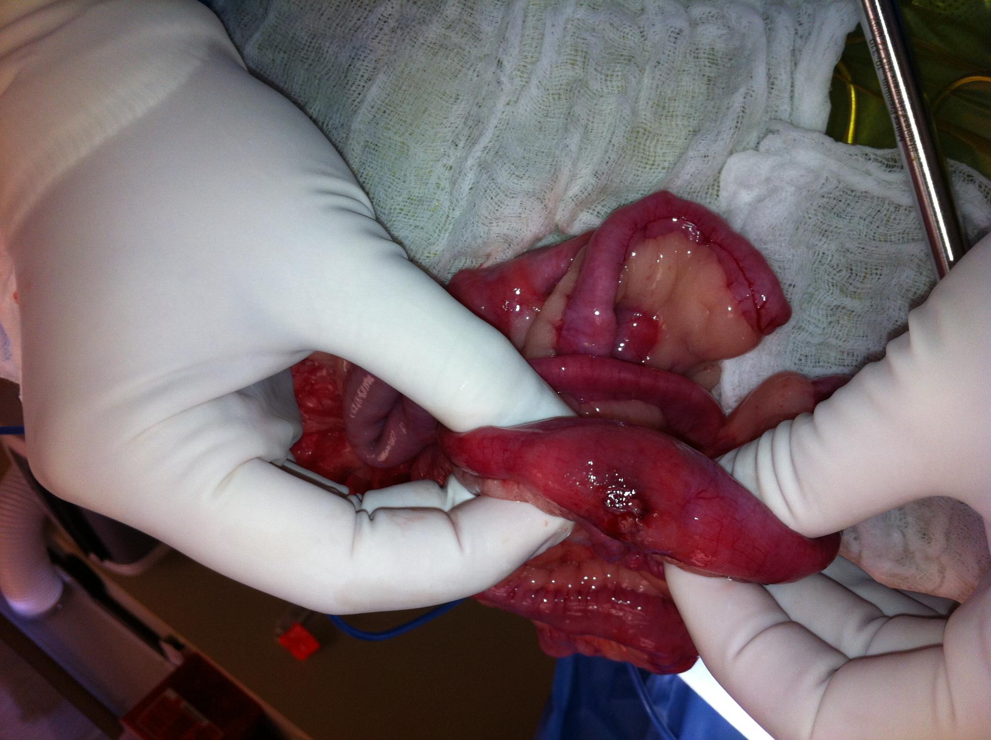 8 yr old M/N Corgi, prior history of LSA in remission for the last 1.5 years. Acutely presents for progressive anorexia x 5 days. Physical examination shows normal lymph nodes (PCR negative for LSA), tender on GI palpation. Exploratory surgery performed. What's your diagnosis?