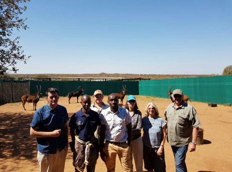 This pen is what they call a Boma in South Africa. We are at Sable Ranch which is a Private Natural Heritage Site supported by proactive breeding of rare Sable (which you see behind us) and Roan antelope, luxury game lodge accommodation (www.thabakhaya.co.za), bush lodge and lion sanctuary. The gentleman on the left is Dr. Morne de la Rey, the Director of Embrio Plus (www.embryoplus.com), a veterinarian that specializes in embryo transfer, in vitro fertilization, and artificial insemination. He has been recruited to utilize his skills and knowledge to apply these techniques to endangered species in the hopes that they can be saved from extinction. The next 2 gentlemen in the foreground are Kenya Wildlife Services veterinarians who care for the last 3 Northern White Rhino. Check out this really cool (but sad) infographic about Sudan and the story of the northern whites! http://www.olpejetaconservancy.org/uploads/assets/uploads/2015/11/OP_Infographic_Updated_2015.pdf