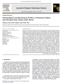 Peripartum mares and neonatal foals are physiologically unstable. Although hormonal changes around the parturition have been well studied in the field of endocrinology, hematological and biochemical changes have been studied little. The purpose of this study was to examine hematological and biochemical changes in peripartum mares and neonatal foals (n = 23; heavy draft horse). This study revealed hematological and biochemical dynamics in peripartum mares and neonatal foals.